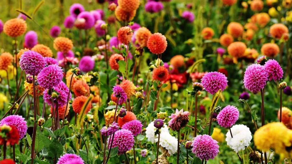 - Dalie (Dahlia): Kwiaty o różnorodnych kształtach i kolorach. Kwitną od lipca do października.