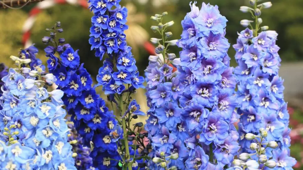 - Ostróżki (Delphinium): Wysokie rośliny z kwiatami zebrane w groniaste kwiatostany. Kwitną w czerwcu i lipcu.
