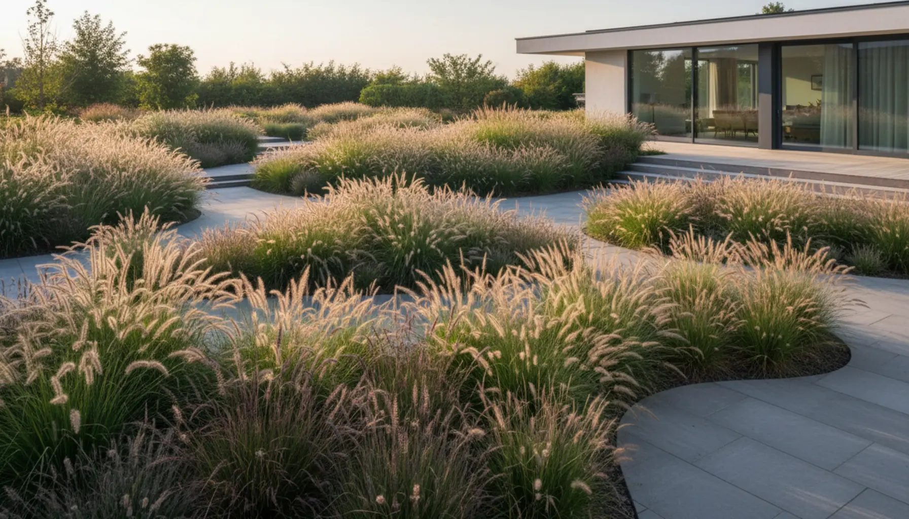 Silnym trendem w aranżacjach jest łączenie traw ozdobnych z krzewami liściastymi i iglastymi, zwłaszcza w ogrodach nowoczesnych i minimalistycznych. Na tle ciemnych iglaków – sosen pospolitych w formie naturalnej, jałowców płożących czy kolumnowych żywotników – jasne, przewiewne wiechy trzcinnika ostrokwiatowego lub prosa rózgowatego stają się świetlistym akcentem, który ożywia kompozycję przez cały sezon. Trawy pięknie łagodzą też ostre linie żywopłotów z bukszpanu, grabu czy ligustru, sprawiając, że formalne założenia ogrodowe zyskują więcej swobody. W połączeniu z krzewami o dekoracyjnych liściach – jak dereń biały o pstrych liściach, pęcherznica o ciemnoczerwonej barwie czy klony palmowe – trawy o neutralnych odcieniach (beże, szarości, zielenie) podkreślają kolorystykę krzewów, nie konkurując z nimi. W ogrodach nowoczesnych popularne jest łączenie prostych gatunków traw, takich jak proso, kostrzewy czy miskanty o wąskich, wyprostowanych liściach, z betonem architektonicznym, stalą kortenowską lub drewnem. Sadzone w żwirowym rabatach między płytami tarasowymi czy przy prostych donicach, trawy przełamują surowość materiałów i nadają przestrzeni miękkości. Warto też wykorzystać trawy w ogrodach żwirowych i skalnych, gdzie łączone są z rozchodnikami, rojnikami, macierzanką czy szałwiami – drobne kamienie tworzą naturalne tło dla kępek kostrzewy sinej, turzyc i niskich ostnic, a rośliny o srebrzystych liściach (np. santolina, lawenda, czyściec wełnisty) potęgują wrażenie śródziemnomorskiego klimatu. Trawy świetnie sprawdzają się również jako element kompozycji wokół wody: gatunki lubiące wilgoć, jak mozga trzcinowata czy miskant cukrowy, zestawione z kosaćcami syberyjskimi, tawułkami i funkiami tworzą miękką, naturalną linię brzegową oczka lub strumyka. W mniejszych ogrodach czy na tarasach trawy można sadzić w dużych donicach razem z innymi roślinami – rozplenica z pelargoniami, turzyce z wrzosami i wrzoścami, hakonechloa z miniaturowymi hortensjami – tworzą mobilne kompozycje, które łatwo przestawiać i zmieniać w zależności od sezonu. Dobierając towarzystwo dla traw, warto pamiętać o kontraście faktur i proporcjach: delikatne, „piórkowe” wiechy najlepiej prezentują się obok roślin o większych liściach lub wyraźnej strukturze, a wysokie gatunki powinny być łączone z krzewami i bylinami o podobnej skali, aby kompozycja była spójna i harmonijna w różnych porach roku.